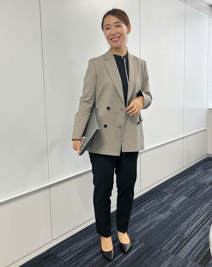 中だるみしやすい水曜日は気を引き締めるためにもセットアップスーツできちんとスタイル。暗くなりすぎないようベージュ×ブルーをチョイス。カラーを取り入れて明るい印象にしました。