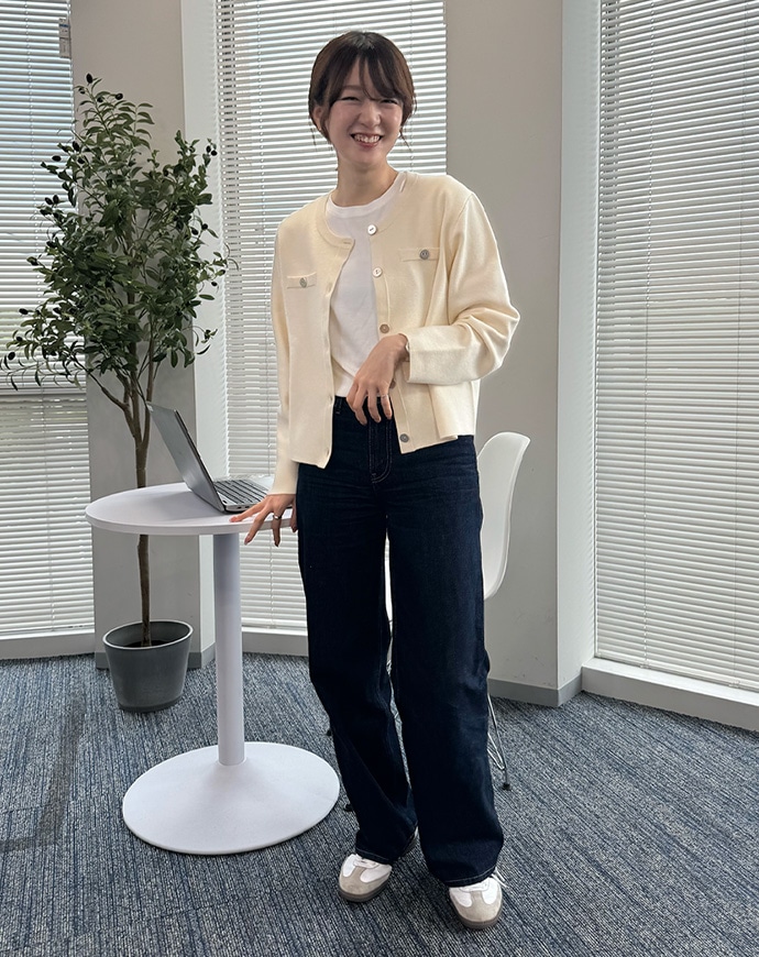 プレス業務、SNSの更新、雑誌編集部との打ち合わせなど毎日バタバタだけど充実!カジュアルなスタイリングがすき♡休日はインスタでレシピを探して美味しいおつまみを作ったりお笑い番組を見ながらのんびりするのが最高。