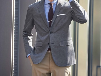 チノパンをテーラードタイプのジャケットと組み合わせると、いわゆるジャケパンスタイルになります。