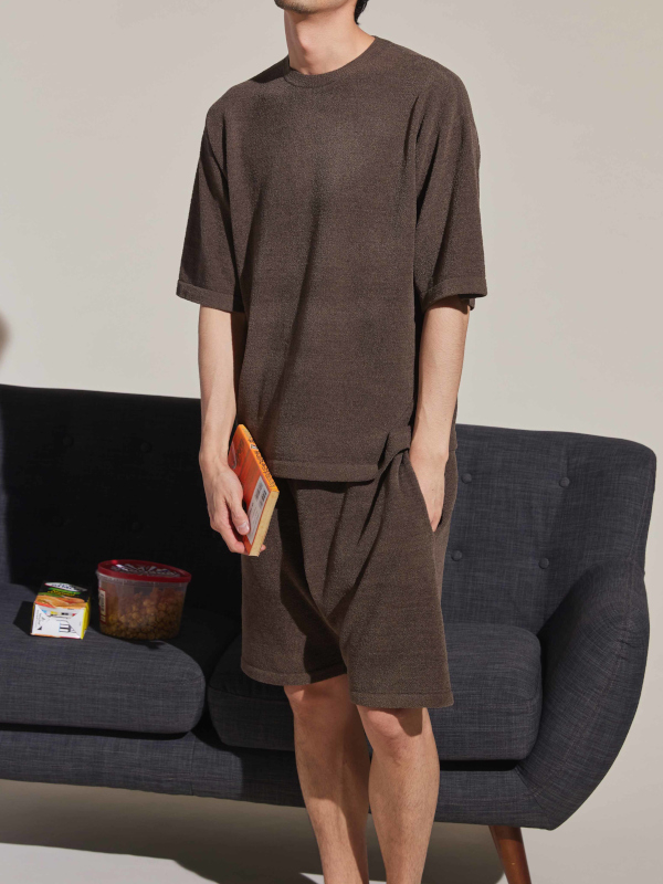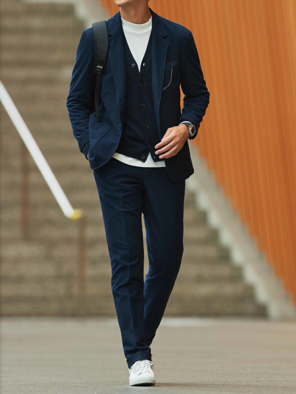 こちらのコーデはネイビーのコーデュロイのセットアップに白のインナーを合わせ、全体的に落ち着きを演出しながらも、清潔感のある色の組み合わせとなっています。