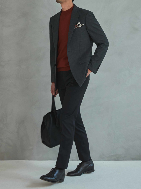 こちらのコーデはダークカラーのセットアップに赤茶のニットを合わせることで、シックなベースの中で暖かみと洗練されたセンスをさりげなくアピールしています。