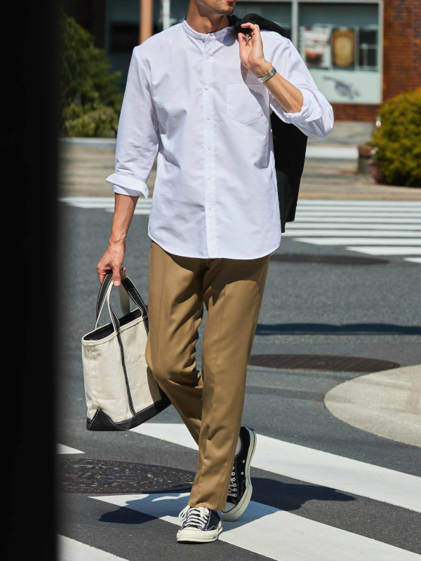 白シャツは「清潔感」を効果的にアピールできるアイテムで、バンドカラー(襟なし)シャツは、通常の襟付きシャツよりこなれたおしゃれさがあり、親しみやすさを演出してくれます。