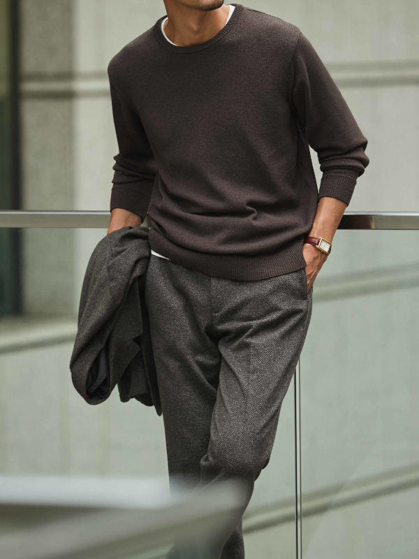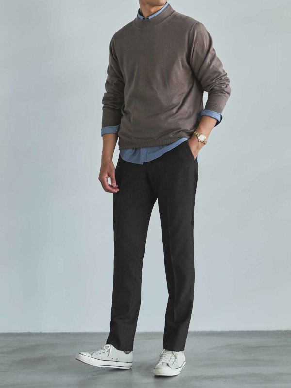 肌寒い季節はシャツとセーターのレイヤードなどもおすすめ。 ブラウンのセーターに濃いチャコールグレーのパンツという組み合わせが、40代ならではの知性と経験を感じさせます。