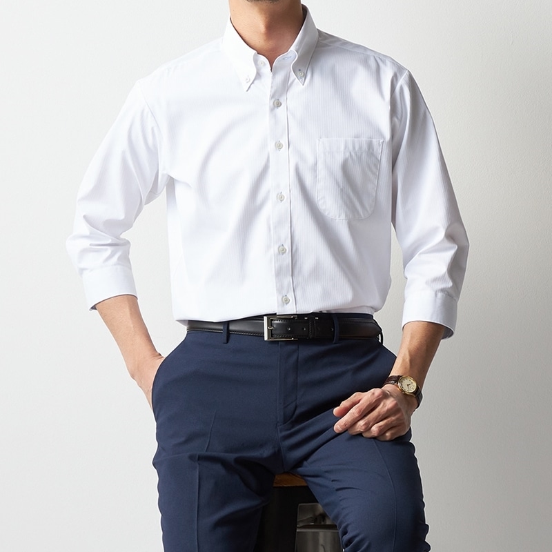 七分袖の白シャツだとビジネス感も薄く、ボタンダウンなどカジュアル寄りのシャツであれば丁度良いバランスになります。