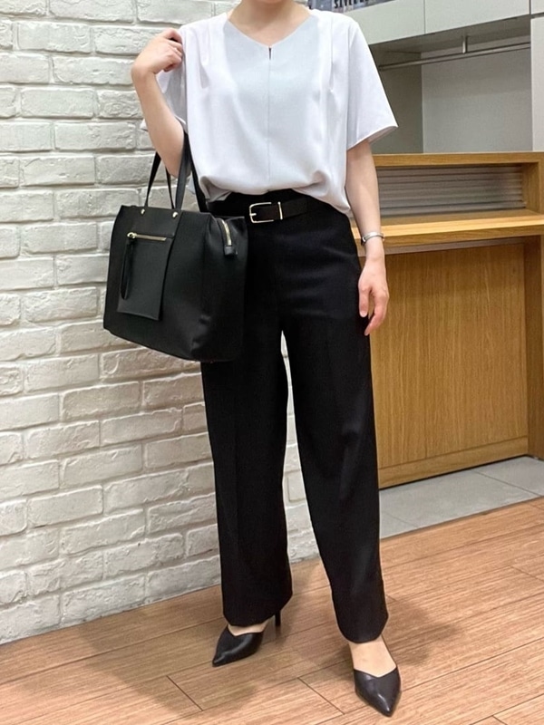 暑い夏場はカットソーやブラウスのみになることが多いと思いますが、ボトムスに少しワイドなシルエットのパンツを合わせたりすると涼しげな印象になります。
