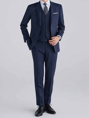 写真のような無地の紺のジャケットとパンツを組み合わせてスーツのように着るのも、それぞれを単品で着るのも自由です。