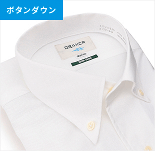 襟先にボタンのついたボタンダウンは、ワイドカラーに比べてややカジュアルな印象です。クールビズ等のノーネクタイスタイルに最適。