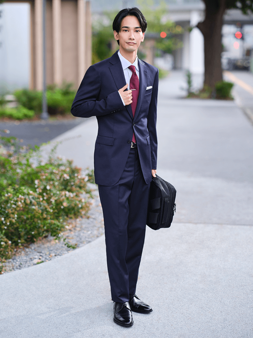 上質素材のスーツを使った上品なスタイリング。ワインのネクタイが入社式に相応しい華やかさを演出します。スーツは入社式&ビジネスシーンだけでなく結婚式にも最適です。