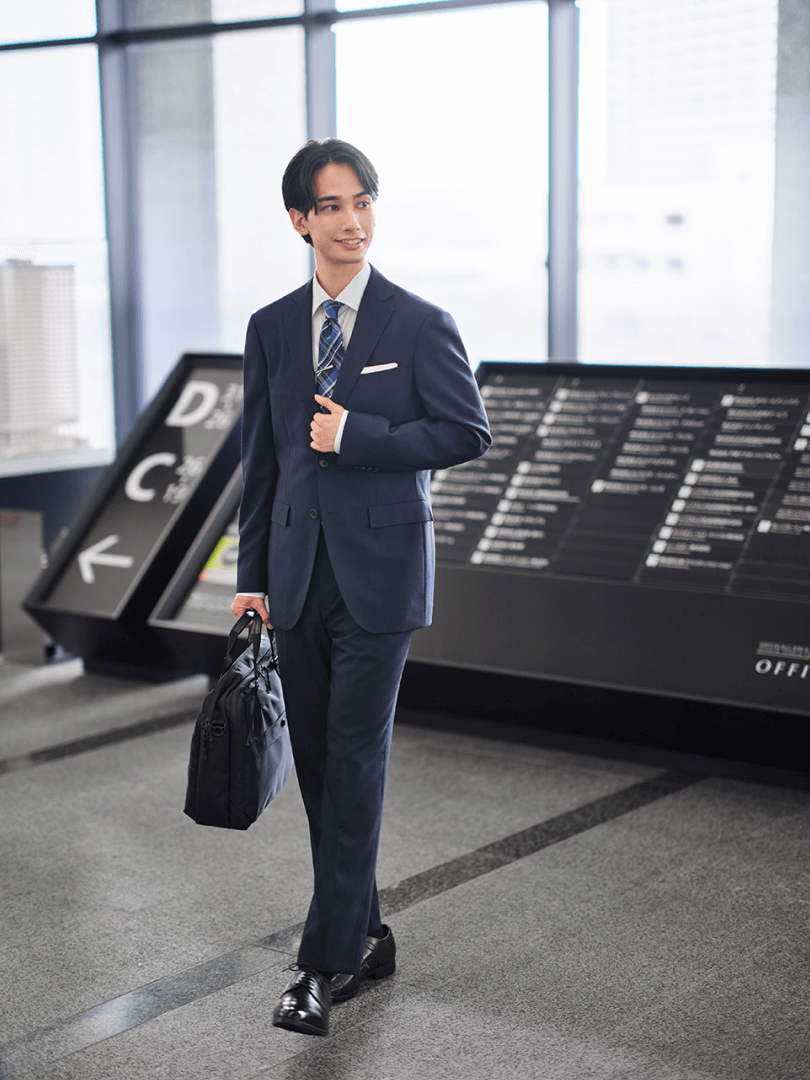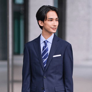 若々しいフレッシュを最大限に発揮してくれるのがネイビースーツ。清潔感や爽やかさを感じさせ、なおかつ主張しすぎない謙虚さも持ち合わせた色で、2パンツタイプであれば着まわしも◎。ネクタイも同じブルー系でまとめれば、コーディネートも簡単。