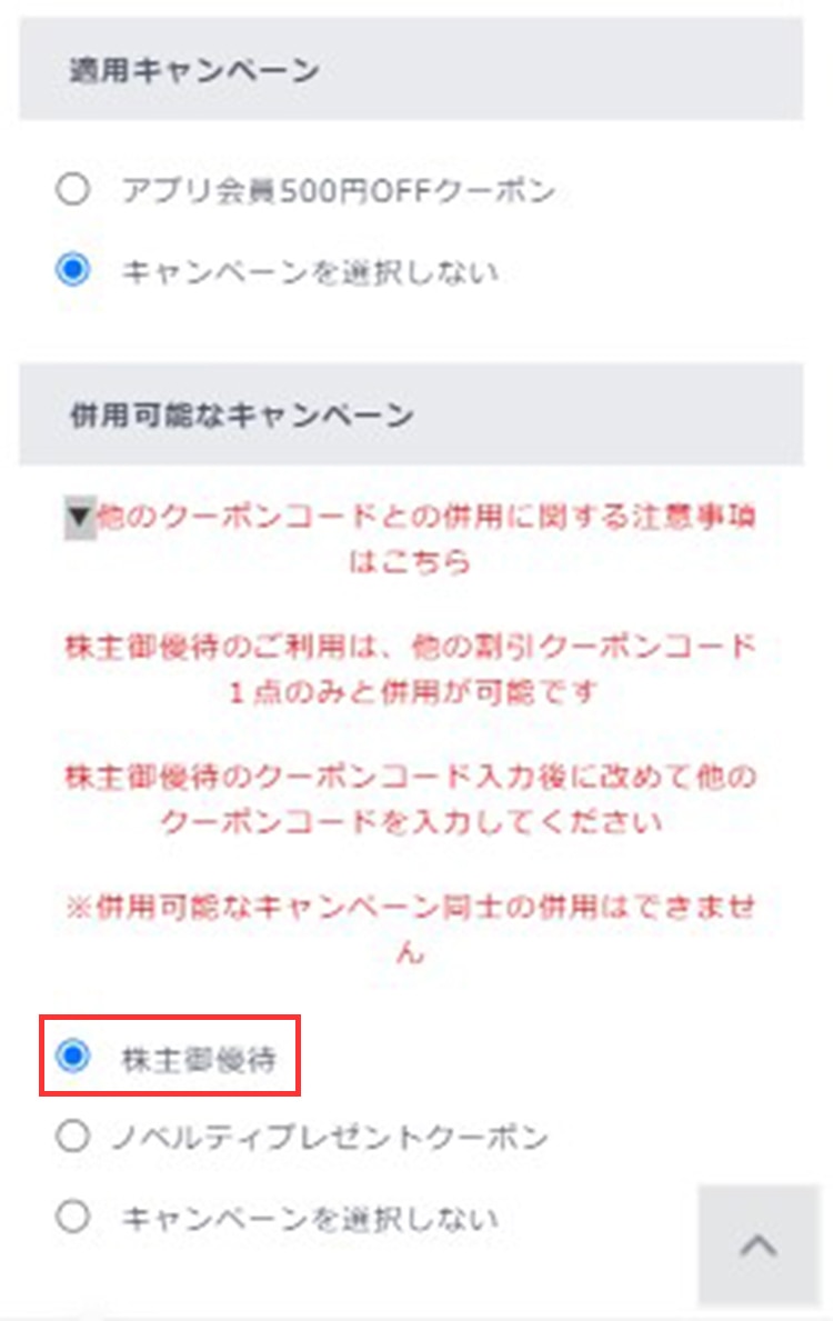 ※併用するクーポンコードは株主御優待を適用後に改めて入力し「適用キャンペーン」の中から併用したいキャンペーンを選択してください。