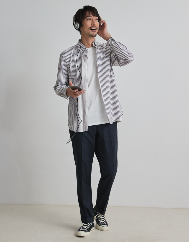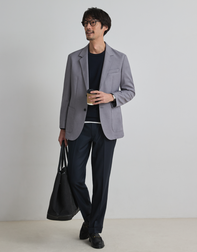 ジャケット、パンツ、それぞれ単品でも使いやすいように、生地は無地かチェック柄。落ち着いた色柄は合わせるアイテムを問わないので、コーディネートの幅も広がります。