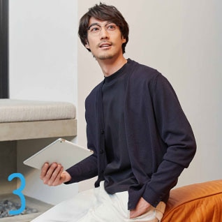 モックネックTシャツで在宅ワーク。襟付きのカーディガンは一見するとジャケット見えするので、オンライン会議などでもラフになりすぎずにオススメです。